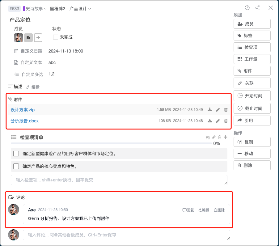 Leangoo 的任务卡片支持评论功能,团队成员可以直接在卡片上讨论任务细节,同时上传相关资料(如分析报告、设计方案)。相比传统邮件和会议模式,这种方式更加高效,确保所有信息都集中在任务本身。