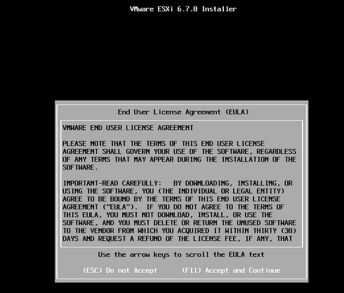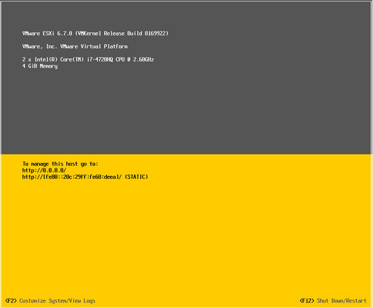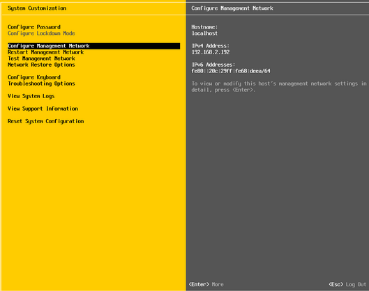重启之后,刚才祼机硬盘中的已经有了ESXi系统,ESXi服务器全文本界面,因为真实的环境下我们平常基本很少需要在这台服务器上进行操作,有关的操作如创建管理虚拟服务器等,都可以在浏览器/vSphereClient上进行(6.5之后官方开始推荐直接浏览器界面配置了); 不过在此之前,我们需要对ESXi的网络进行一些配置,vSphere Client对其的控制也是通过网络进行的,我们必须事先为ESXi配置好访问IP。