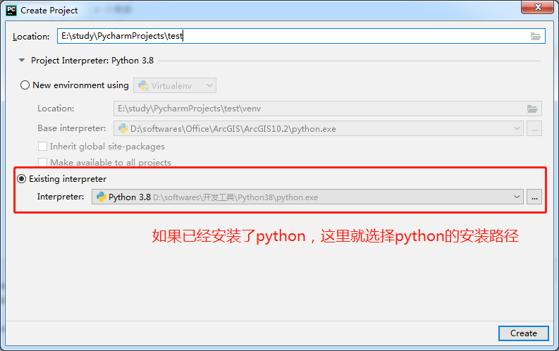 3、如果有安装Python,选择Existing Interpreter,手动选择Python的安装路径;否则就选择New environment using。