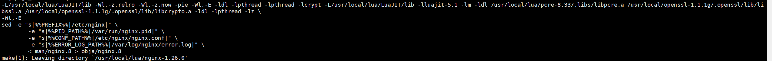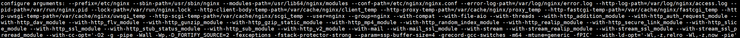 ./configure --prefix=/usr/local/nginx --sbin-path=/usr/sbin/nginx --modules-path=/usr/lib64/nginx/modules --conf-path=/usr/local/nginx/conf/nginx.conf --error-log-path=/var/log/nginx/error.log --http-log-path=/var/log/nginx/access.log --pid-path=/var/run/nginx.pid --lock-path=/var/run/nginx.lock --http-client-body-temp-path=/var/cache/nginx/client_temp --http-proxy-temp-path=/var/cache/nginx/proxy_temp --http-fastcgi-temp-path=/var/cache/nginx/fastcgi_temp --http-uwsgi-temp-path=/var/cache/nginx/uwsgi_temp --http-scgi-temp-path=/var/cache/nginx/scgi_temp --user=nginx --group=nginx --with-compat --with-file-aio --with-threads --with-http_addition_module --with-http_auth_request_module --with-http_dav_module --with-http_flv_module --with-http_gunzip_module --with-http_gzip_static_module --with-http_mp4_module --with-http_random_index_module --with-http_realip_module --with-http_secure_link_module --with-http_slice_module --with-http_ssl_module --with-http_stub_status_module --with-http_sub_module --with-http_v2_module --with-mail --with-mail_ssl_module --with-stream --with-stream_realip_module --with-stream_ssl_module --with-stream_ssl_preread_module --with-cc-opt='-O2 -g -pipe -Wall -Wp,-D_FORTIFY_SOURCE=2 -fexceptions -fstack-protector-strong --param=ssp-buffer-size=4 -grecord-gcc-switches -m64 -mtune=generic -fPIC' --with-ld-opt='-Wl,-z,relro -Wl,-z,now -pie' --with-pcre=/usr/local/lua/pcre-8.33 --add-module=/usr/local/lua/ngx_devel_kit-0.3.0 --add-module=/usr/local/lua/lua-nginx-module-0.10.25