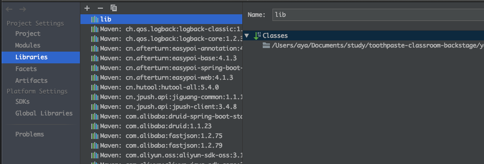 2.file->project structure 选择Libraries然后点击右上方的+号选择jar 并将刚刚创建的lib目录导入