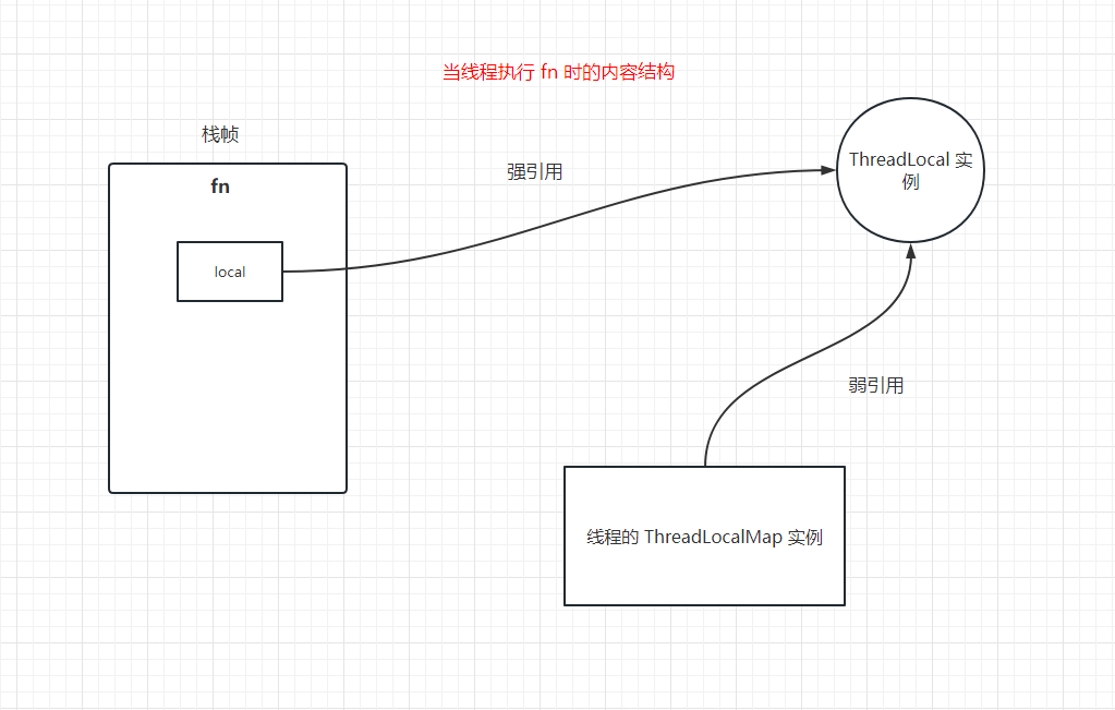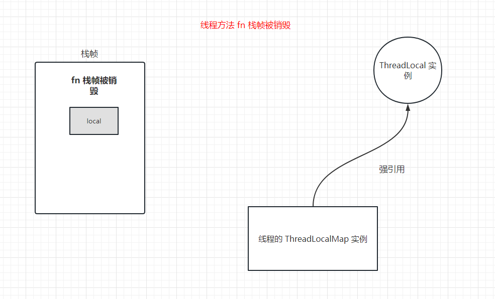 1、当线程执行完fn()方法后,fn()的方法栈帧将被销毁,强引用local的值也就没有了,但此时线程的