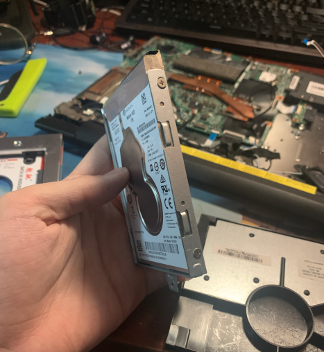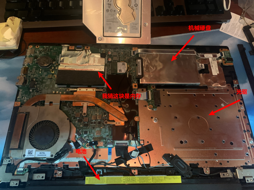 其实这是已经换好的图了,刚拆开是各个部件是这么个位置。先把机械硬盘拆下来换上我新买的固态硬盘。