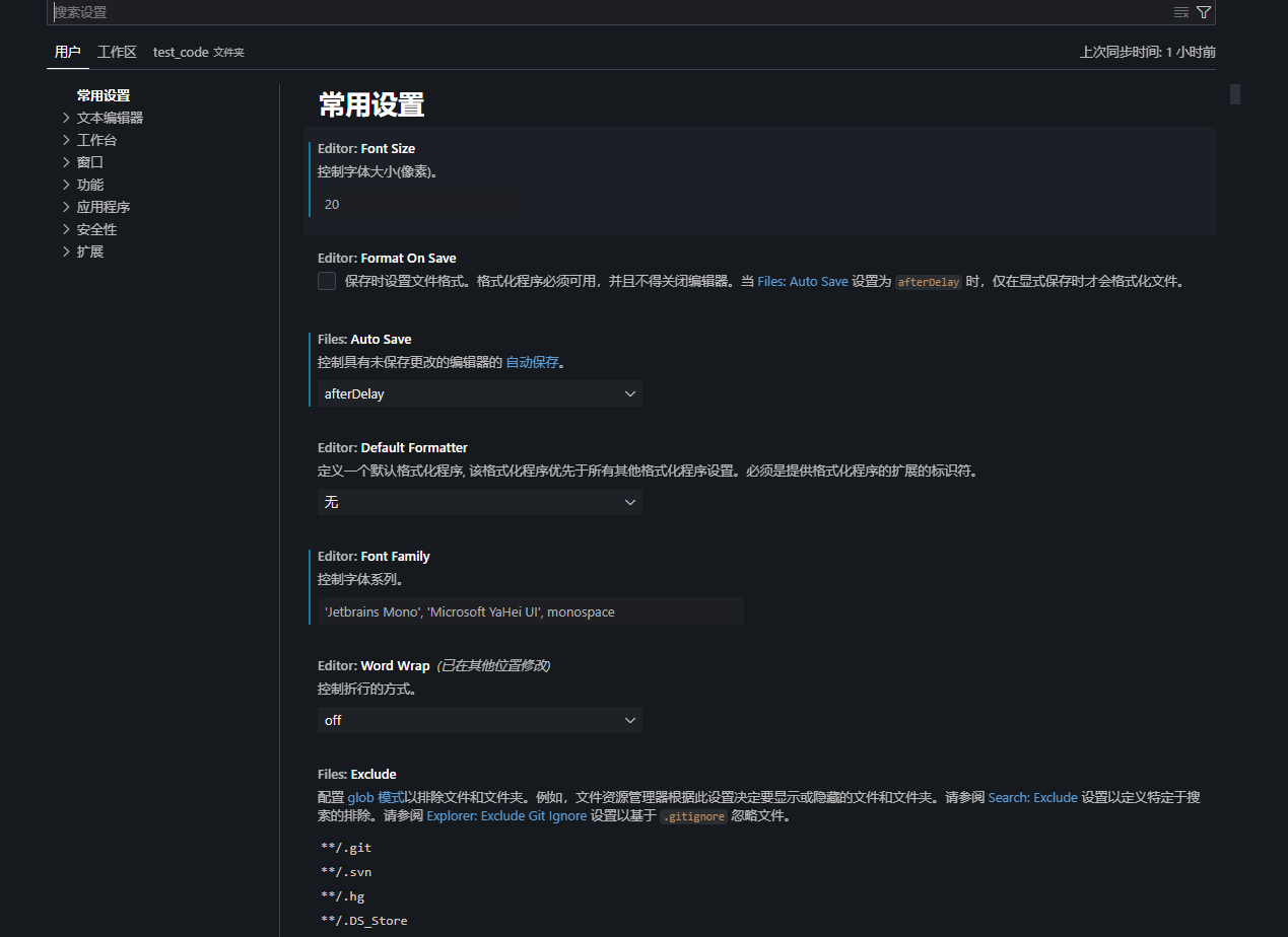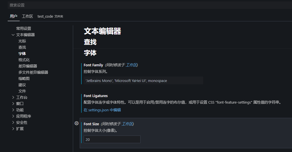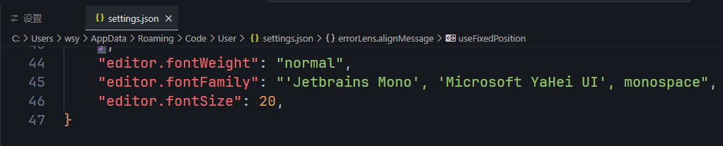 // setting.json { "window.zoomLevel": 0, "editor.fontWeight": "normal", "editor.fontFamily": "'Jetbrains Mono', 'Microsoft YaHei UI', monospace", "editor.fontSize": 20, }