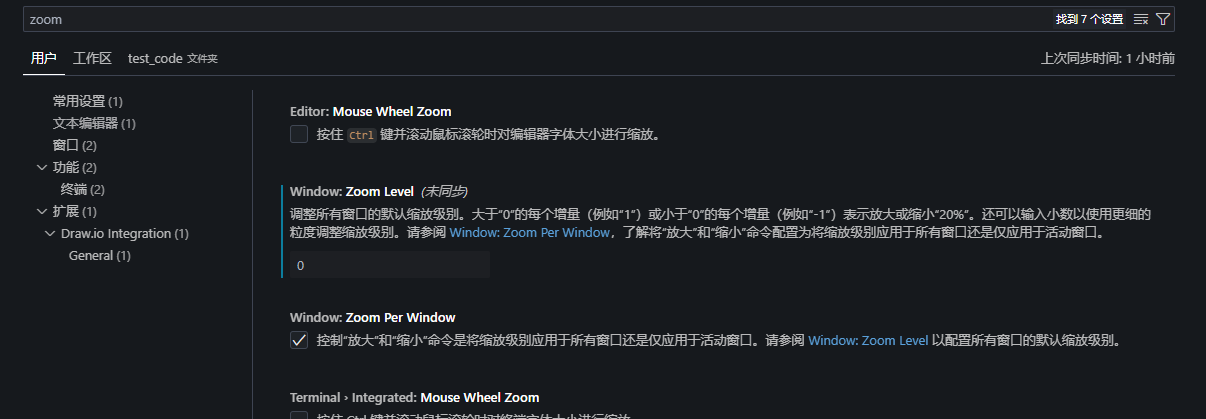 ctrl +,ctrl -分别控制缩放增大,减小。 - 快速搜索设置项的快捷键