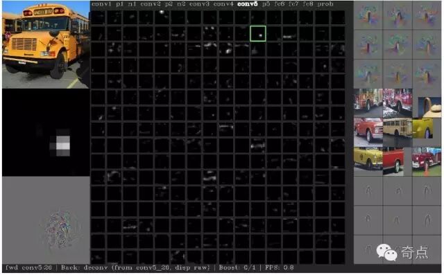 当数据一层一层通过更多的卷积层时,你可以得到的特征图像代表的特征就会更加的复杂。在网络的最后,你也许可以得到一个抽象的物体。如果你想通过可视化方法在卷积神经网络中看到更多的信息。这里有一个工具方便你查看https://github.com/yosinski/deep-visualization-toolbox,它的效果如下图所示: