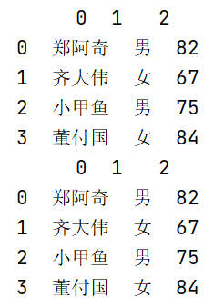 lst=[["郑阿奇","男",82],["齐大伟","女",67],["小甲鱼","男",75],["董付国","女",84]]