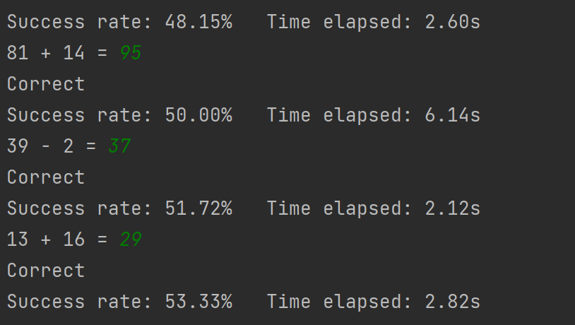 import java.util.Scanner; public class MathExercisesApp { public static void main(String[] args) { MathExerciseGenerator generator = new MathExerciseGenerator(); String[] exercises = generator.generateExercises(300); Scanner scanner = new Scanner(System.in); int numCorrect = 0; for (int i = 0; i < exercises.length; i++) { long timeStart = System.currentTimeMillis(); // start timing String exercise = exercises[i]; String[] parts = exercise.split(" "); int operand1 = Integer.parseInt(parts[0]); String operator = parts[1]; int operand2 = Integer.parseInt(parts[2]); int result = 0; if (operator.equals("+")) { result = operand1 + operand2; } else if (operator.equals("-")) { result = operand1 - operand2; } if (result > 100) { continue; // skip the current exercise } System.out.print(exercise); int answer = scanner.nextInt(); if (generator.checkAnswer(exercise, answer)) { System.out.println("Correct"); numCorrect++; } else { System.out.println("Incorrect"); } double successRate = ((double)numCorrect / (i+1)) * 100; System.out.printf("Success rate: %.2f%% ", successRate); long timeEnd = System.currentTimeMillis(); // end timing double timeElapsed = (timeEnd - timeStart) / 1000.0; // convert time to seconds System.out.printf("Time elapsed: %.2fs\n", timeElapsed); } double finalScore = ((double)numCorrect / exercises.length) * 100; System.out.printf("Final score: %.2f%% (%d out of %d)\n", finalScore, numCorrect, exercises.length); } }