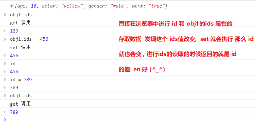 这里使用 一个变量 id 与 这个ids属性建立关联, 当读取obj1 的ids 属性时, get()函数 <=> getter 就会调用, 且返回值就是 id 的值,