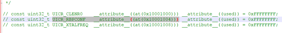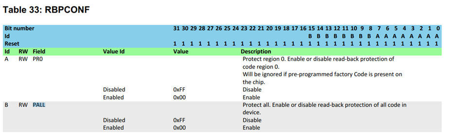 NRF51822的内存保护由UICR(用户信息配置寄存器)中的RBPCONF寄存器处理,这组寄存器配置了芯片的一些运行信息如bootloader地址,代码段长度等等。