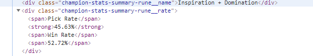 #获取符文信息 runes_tbody=champion_text.find_next_siblings('div')[0].tbody runes_tag=runes_tbody.tr.td.div runes_div=runes_tag.div.find_next_siblings('div') runes_div.append(runes_tag.div) rune_ls=[] for rune in runes_div: tmp=[] #匹配符文名 pattern8=re.compile(r'<div class="champion-stats-summary-rune__name">(.*?)</div>') z=[] for i in re.findall(pattern8,str(rune.a)): s=i.split(' + ') if s[0] in item.keys(): s[0]=item[s[0]] if s[1] in item.keys(): s[1]=item[s[1]] z=' + '.join(s) tmp.append(z) pattern9=re.compile(r'<strong>(.*?)</strong>') tmp.append(re.findall(pattern9,str(rune.a))) pattern10=re.compile(r'<span>(\d.*?)</span>') tmp.append(re.findall(pattern10,str(rune.a))) rune_ls.append(tmp) #rune_ls格式为[[[符文名],[登场率],[胜率]]]