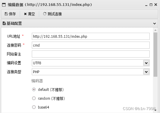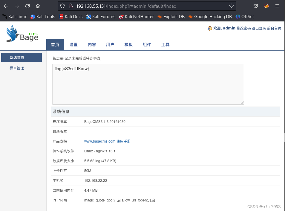 登录后发现网站使用了很多模块化文件。而且都是php文件格式,我们直接在其中的一个php文件中写入一句话木马,然后用蚁剑连接,注意这里的网址使用的是模块化,不能直接加在网站上,要用?r=模块文件的方式访问模块文件,再用蚁剑连接,注意,因为这里只是靶场,用的都是虚拟机的仅主机模式,所以蚂剑可以直接连接,平时正常情况下是不行的,需要给蚁剑配置kali一样的代理,这里是靶场就不用了
