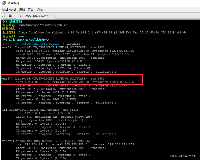 通过蚂剑的虚拟终端去查看一下CentOS的网卡信息发现还有一个55网段的内网ip,话不多说,继续干