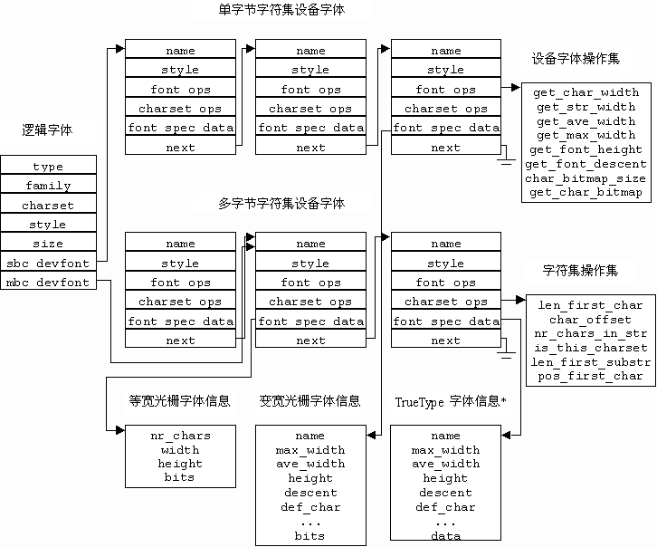 在 MiniGUI 中,每个逻辑字体至少由一个单字节的设备字体组成。设备字体是直接与底层字体相关联的数据结构。每个设备字体有一个操作集(即 font_ops),其中包含了 get_char_width、get_char_bitmap 等抽象接口。每个 MiniGUI 所支持的字体类型,比如等宽光栅字体(RBF)、变宽光栅字体(VBF)、TrueType 字体、Adobe Type1 字体等均对应一组字体操作集。通过这个字体操作集,我们就可以从相应的字体文件中获得某个字符的点阵(对光栅字体而言)或者轮廓(对矢量字体而言)。之后,MiniGUI 上层的绘图函数就可以将这些点阵输出到屏幕上,最终就可以看到显示在屏幕上的文字。