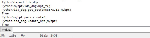 在ida的break list窗口中,有一列就是pass count,我猜测就是用来指定断点次数的,但是我没有找到能设置pass count的地方,查资料查了好久,最后使用了脚本来实现