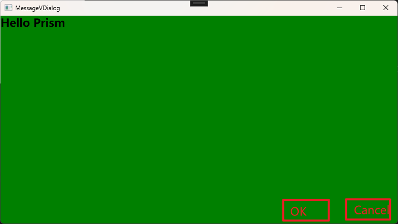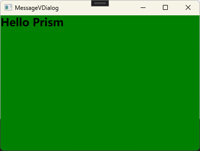 MessageVDialog,代码与CustomDialog一致,不同的是将背景改为Green,并且在App.xaml.cs中注册protected override void RegisterTypes(IContainerRegistry containerRegistry) { containerRegistry.RegisterDialog<GreetingView>(); containerRegistry.RegisterDialogWindow<CustomDialog>(); containerRegistry.RegisterDialogWindow<MessageVDialog>(); // 最后一个注册的DialogWindow将作为默认弹窗模板 } -