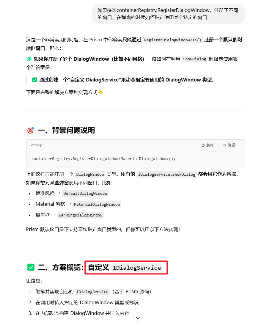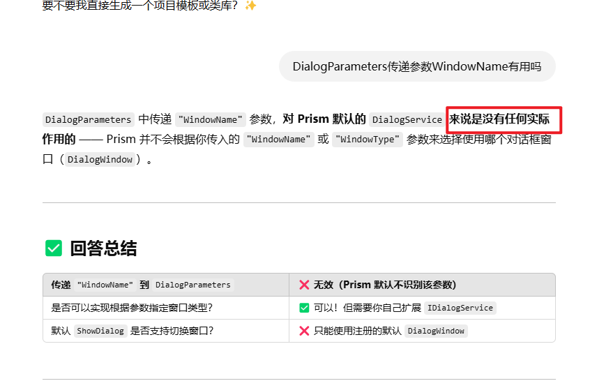 // App.xaml.cs protected override void RegisterTypes(IContainerRegistry containerRegistry) { containerRegistry.RegisterDialog<GreetingView>(); containerRegistry.RegisterDialogWindow<CustomDialog>("CustomDialog"); containerRegistry.RegisterDialogWindow<MessageVDialog>(); // 最后一个注册的DialogWindow将作为默认弹窗模板 } // MainViewModel.cs DialogParameters para = new DialogParameters() { { KnownDialogParameters.WindowName, "CustomDialog"}, // 如果注释该行,则使用 MessageVDialog 模板 }; DialogService.ShowDialog(nameof(GreetingView), para);