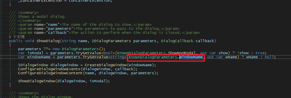 DialogService.ShowDialog中发现了一个参数:KnownDialogParameters.WindowName = "windowName" -