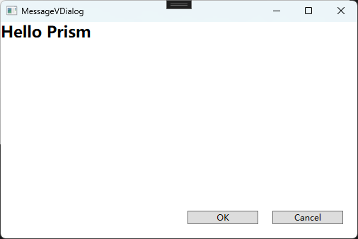 MessageVDialog的模板<Window.Template> <ControlTemplate TargetType="Window"> <Border Background="White"> <Grid> <Grid.RowDefinitions> <RowDefinition /> <RowDefinition Height="Auto" /> </Grid.RowDefinitions> <ContentControl Content="{TemplateBinding Content}" /> <StackPanel Orientation="Horizontal" HorizontalAlignment="Right" Grid.Row="1" Margin="20"> <Button Content="OK" Width="100" Click="OKButton_Click" /> <Button Content="Cancel" Margin="20 0 0 0" Width="100" Click="CancelButton_Click" /> </StackPanel> </Grid> </Border> </ControlTemplate> </Window.Template>private void OKButton_Click(object sender, RoutedEventArgs e) { Result = new DialogResult(ButtonResult.OK); this.DialogResult = true; } private void CancelButton_Click(object sender, RoutedEventArgs e) { Result = new DialogResult(ButtonResult.Cancel); this.DialogResult = false; } -