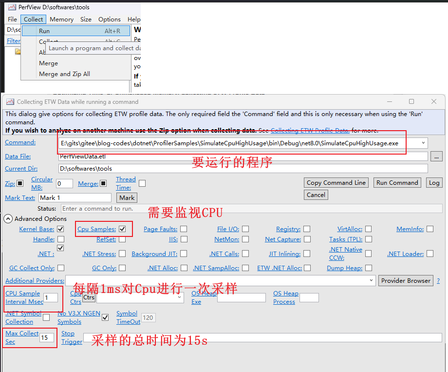 打开 PerfView,并设置要指定运行的程序,并且设置1ms对cpu进行采样一次,采样总时长为15秒
