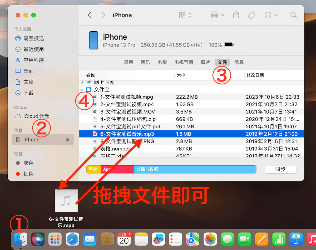 4.找到文件宝App,点击展开箭头,如图中④标识,然后就可以拖拽文件到电脑上或App里啦