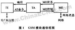 移动设备me主要负责与gsm网络进行无线通信,终端适配器ta负责me与外部终端设备te的信息交换,at指令就是在ta与te之间传送的。te可以是pc,或者是单片机系统,通过at指令与me进行信息交互。现在市场上的gsm模块,如tc35、falcom等,都把me和ta集成在一起,这样整个通信就变成了te与gsm模块之间的通信了。