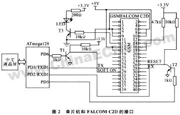 在本设计中,采用的gsm通信模块为falcomc2d,单片机使用的是atmel公司的高速8位处理器atmega128。atmega128内部集成有4kb的ram,4kb的eeprom,128kb的flash,以及2个uart串行接口等。其高速和大容量ram的特性,为处理短消息这样的大数据包提供了便利;同时,节省了外围器件,使得硬件结构简化,提高系统可靠性。中文液晶屏用来显示接收到的中英文短信。系统的硬件接口框图如图2所示。