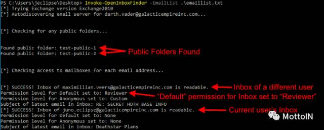 在下面的示例中,命令终端以名为”jeclipse“的域名用户名运行。再从域中的电子邮件列表中运行Invoke-OpenInboxFinder后,发现了两个公用文件夹。此外”jQuery“可以访问”maximillian.veers@galacticempireinc.com“的收件箱。Invoke-OpenInboxFinder将会打印出每个项目的权限级别。在输出中可以看到”Default“项设置为”Reviewer“。