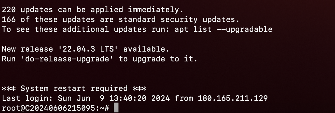 如果一切顺利,在输入完正确的服务器密码后您将成功远程ssh到您的服务器,结果如下所示: