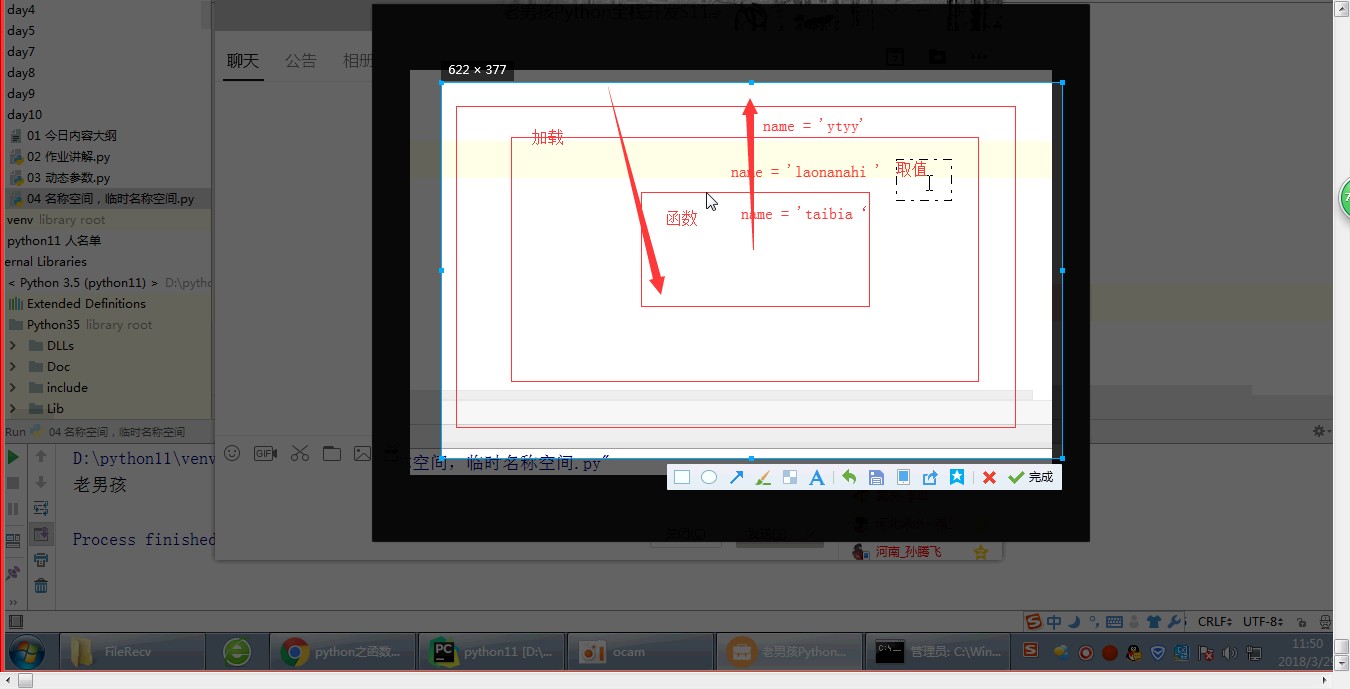 1 a = 4 2 b = 3 3 c = [1,2,3,4] 4 c1 = {'name':'alex'} 5 6 def func1(): 7 name = '老男孩' 8 print(name) 9 func1() 10 当执行函数的时候,他会在内存中开辟一个临时名称空间,存放函数体内的所有变量与值的关系, 11 随着函数的执行完毕,临时空间自动关闭。 12 input(),print(),len 内置函数 13 14 name = '老男孩' 15 def func1(): 16 name = 'taibai' 17 print(name) 18 func1() 19 def my_len(argv): 20 return 666 21 print(len([12,3,])) 22 a = 2 23 print(a) 24 def func1(): 25 age = 11 26 print(age)