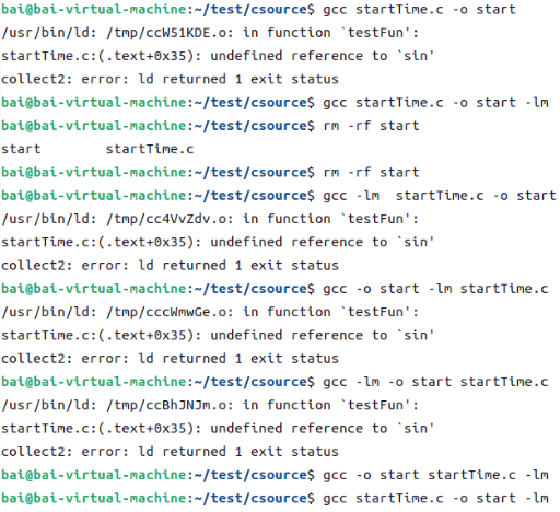 但当遇到代码文件中遇到数学函数时,在编译/链接时需要在gcc后面添加链接参数-lm,而它的位置却不能随意指定。