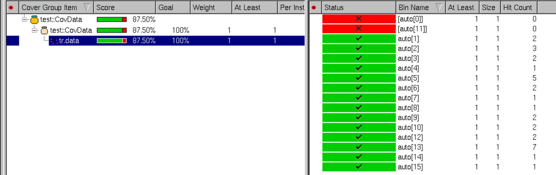 program automatic test (); class Transaction; // data or class properties rand bit [3:0] data; rand bit [4:0] addr; endclass : Transaction Transaction tr=new; covergroup CovData; coverpoint tr.data; endgroup initial begin CovData cd=new; repeat(32) begin tr.data=$random; cd.sample(); end $display("finished!"); end endprogram : test