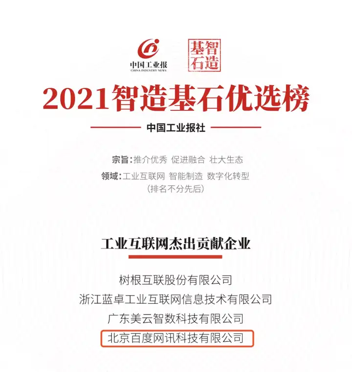 本次与百度智能云开物同时入选“工业互联网杰出贡献企业”的还有“双跨”平台树根互联、浙江蓝卓,以及知名工业互联网企业广东美云智数。