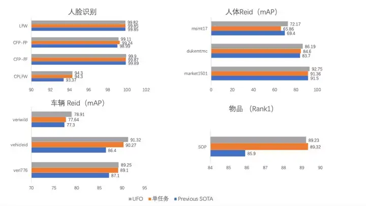 在上图中,灰色表示表示城市视觉All in One UFO模型的结果,橙色表示和UFO模型使用相同模型结构的单任务结果,蓝色表示之前同样数据集上最优的单任务结果。以上所有结果都不使用预训练数据,同时无重排序策略。