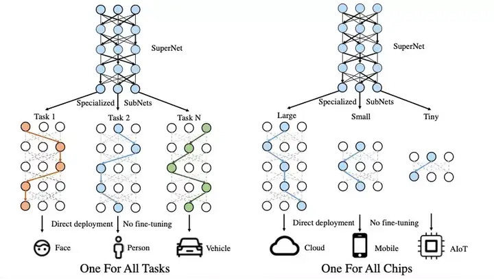 针对大模型的开发和部署问题,UFO给出了One for All的解决方案,通过引入超网络的概念,超网络由众多稀疏的子网络构成,每个子网络是超网络中的一条路径,将不同参数量、不同任务功能和不同精度的模型训练过程变为训练一个超网络模型。训练完成的One for All UFO超网络大模型即可针对不同的任务和设备低成本生成相应的可即插即用的小模型,实现one for all tasks 和one for all chips的能力。