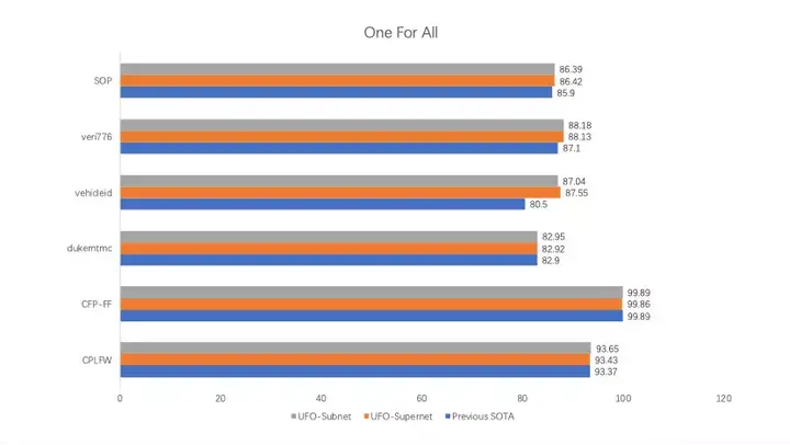 基于上述方案,使用公开数据训练的One for All UFO超网络模型可以在智慧城市人脸、人体、车辆和物品4类任务的6个公开测试集上精度达到SOTA,同时从UFO超网络中抽取的子网络,在参数量压缩20%~30%的情况下,同样可以超过之前SOTA的结果。
