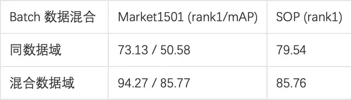 多任务学习首先面临的问题是如何构建Batch。常用的方式有两种,一种是同数据域的Batch组成,即Batch内的数据均来自同一个任务,通过不同的Batch选择不同的任务来保证训练所有任务。另一种是不同数据域的 Batch 组成,即Batch 内的数据来自不同的任务。同数据域的Batch组成面临的问题是当模型中使用BatchNorm这一常见的操作时,因为训练时的统计值(单任务统计值)和测试时的统计值(多任务统计值)差异较大,导致模型效果较差。如下表所示,通过ResNet50结构在人体Market1501和物品SOP两个任务中验证,使用混合数据域方案可以大幅提高两任务的效果。