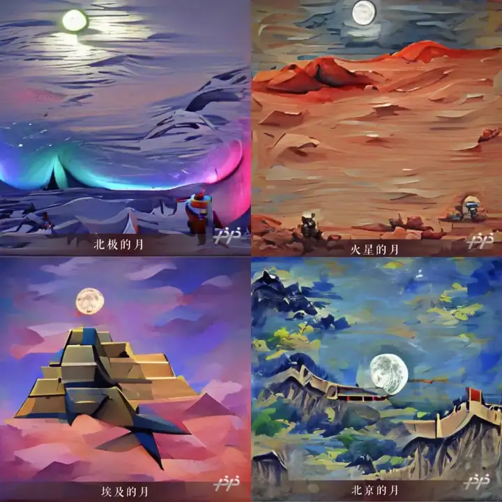 “天下共元宵”活动让每个人都能在AI技术加持下完成一幅图文并茂的艺术作品。参与者只需选定希望赏月的地点,文心大模型就能快速理解并联想创意,运用习得的知名艺术家的技法和画风,创作出符合主题的画作。比如,当我们输入“北京”,文心大模型能够画出盘踞连绵群山之上的长城月空;输入“埃及”,可以看到画作中展现出埃及的象征——金字塔,甚至富有诗意地呈现出月影下的建筑;当输入“火星”时,橘红色的火星表面与角落里勤奋工作的“祝融号”火星车会映入眼帘。