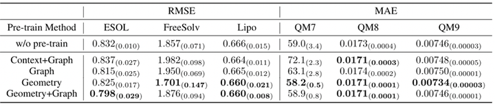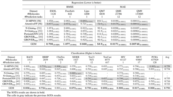 3. 实验结果GEM在14个化合物属性的基准数据集中取得了最佳表现,这些数据集都是目前学术界公认的化合物属性预测数据集。例如,在毒性相关的数据集(tox21、toxcast)和HIV(艾滋病)病毒数据集上,GEM预测结果远优于其他baseline模型。总体而言,百度的GEM模型,在ESOL、FreeSolv等回归任务上相对现在方法提升8.8%,在BACE、BBBP、SIDER等分类任务上相对提升4.7%。此外,在自监督学习方法上的消融实验也证明了基于空间结构的自监督学习方法的有效性。