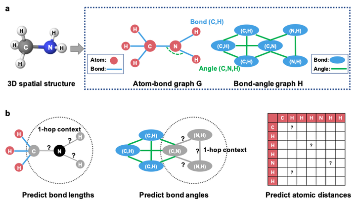 1. 基于空间结构的图神经网络由于化合物的集合结构可以完全被原子-化学键键长-键角确定。GEM提出了一种基于空间结构的图网络,同时对原子-化学键-键角的关系建模空间结构信息。每个化合物由两个图组成:原子-化学键的图G和化学键-键角的图H。类似于过往的工作,原子-化学键的图G以原子作为图的节点,化学键作为连接原子的边。而化学键-键角的图H则为首次引入,以化学键作为图的节点,两个化学键所形成的键角为图的边。图神经网络包含多轮迭代,而化学键作为每一轮迭代中图G和图H的桥梁进行信息互通。最后一轮迭代的表征被用于化合物属性预测。