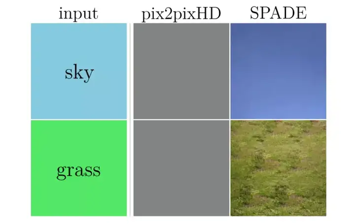 SPADE模块将输入的语义标签分别embedding到两个卷积层上,然后用这两个保留了语义标签空间信息的卷积层代替原来归一化层中的缩放系数和偏置。使用SPADE模块前后的对比如下图: