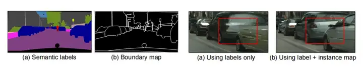 为了进一步改善生成图片的质量,模型还给生成器添加了Instance Map(实例分割标签)作为控制变量: