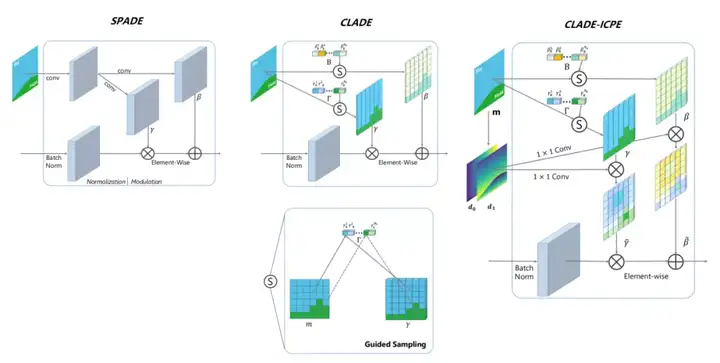 这个开始的思路是:真正使得模型提升效果的是SPADE模块中保留的类别信息,而非空间信息。所以,改进版本的CLADE(Class-Adaptive(De)Normalization)模块只将类别信息映射到了反归一化模块的缩放系数和偏置中,大大节省了参数量和计算量。但后来又发现,保留空间信息还是能使模型的效果提升一些的,就又使用语义标签手动计算了ICPE(intra-class positional encoding类内位置嵌入码)乘到了缩放系数和偏置上。最终版本的CLADE-ICPE 在生成质量与SPADE相当的情况下,大大降低了参数量和计算量。