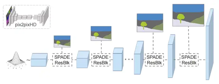 本文介绍的涂鸦应用采用的模型出自文章《Semantic Image Synthesis with Spatially-Adaptive Normalization》。这个模型有个好听的名字GauGAN [1] ,Gau就是梵高的Gau,在风格迁移网络Pix2PixHD的生成器上进行了改进,使用 SPADE(Spatially-Adaptive Normalization)模块代替了原来的BN层,以解决图片特征图在经过BN层时信息被“洗掉”的问题。Pix2PixHD实际上是一个CGAN(Conditional GAN)条件生成对抗网络,它能够通过输入的控制标签,也就是语义分割掩码来控制生成图片各个部分的内容。下面就详细介绍一下GauGAN各个部件的实现细节。