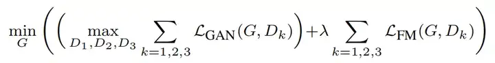 (Multi-scale discriminators)所谓“多尺度”判别器,就是将多个结构相同、输入特征图尺寸不同的一组判别器融合在一起使用。其判别图片时,先将图片缩放成不同尺寸分别送入这些判别器,然后将这些判别器的输出加权相加得到最后的判别输出,这样可以增强判别器的判别能力,使得生成器输出的图片更逼真。