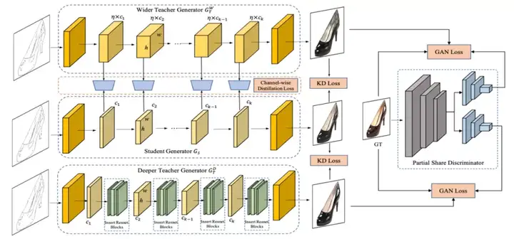 OMGD一边训练两个更深、更宽的教师生成器,一边用其进行蒸馏,能够使过程更加稳定,这就是在线。使用深度相同宽度更宽的教师模型进行蒸馏时,loss函数不但比对输出结果,而且对中间层的特征图也使用Structural Similarity (SSIM) Loss进行比对,是以称之为多粒度。