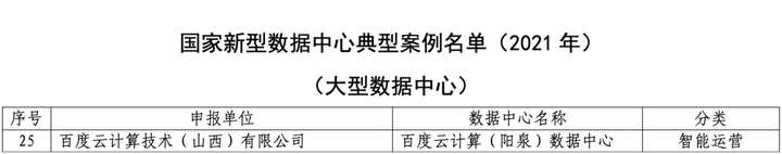 2022年2月7日,百度云计算(阳泉)中心入选《国家新型数据中心典型案例》名单。这是百度继入选《2021年度国家绿色数据中心》的又一喜讯。