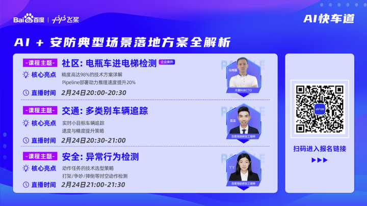 为了让小伙伴们更便捷的应用这些范例教程,百度飞桨于2月24日20:00-21:30为大家准备了直播课程,深度解析从数据准备、方案设计到模型优化部署的开发全流程,手把手教大家进行代码实践。