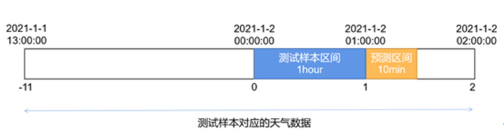 上图为测试集合数据划分方式,-11~1时间段之内积累的数据作为模型的输入,用于预测未来10分钟内(1~2之间)的风速和风向。