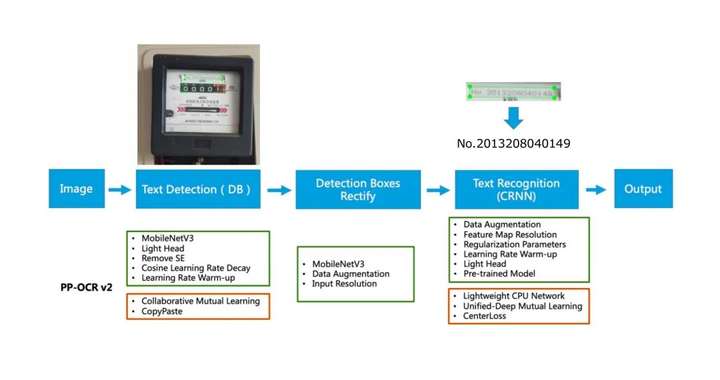 基于上述难点,飞桨开发者技术专家不断进行尝试,最终选用了飞桨文字识别套件PaddleOCR中的PP-OCR模型进行了微调与优化,其检测部分基于DB的分割方法实现,直接解决了电表数据中的倾斜问题,通过再造数据集来扩充识别数据集,训练识别模型。PP-OCR模型经过大量实验,其泛化性也足以支撑复杂垂类场景下的效果。